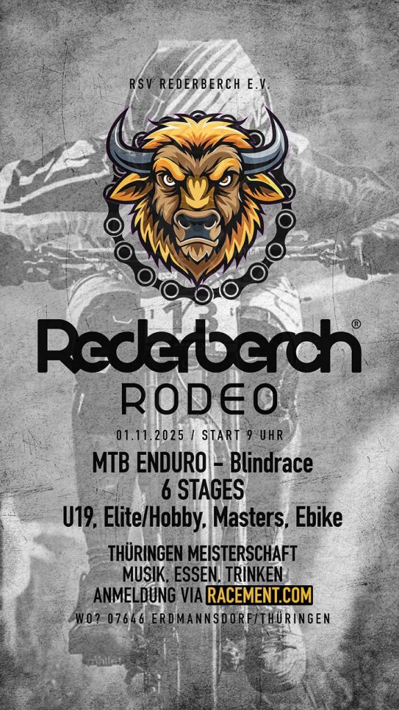 REDERBERCH RODEO 🙌SAMSTAG, 1. NOVEMBER 2025 – MTB Enduro Blindrace am Rederberch in Erdmannsdorf für alle Elite & Hobbyfahrer von U19 bis Masters! 👊 Das Rennen wird für alle Thüringer Lizenzfahrer der Elite & Masters Klassen auch als Thüringer Enduro Meisterschaft gewertet!